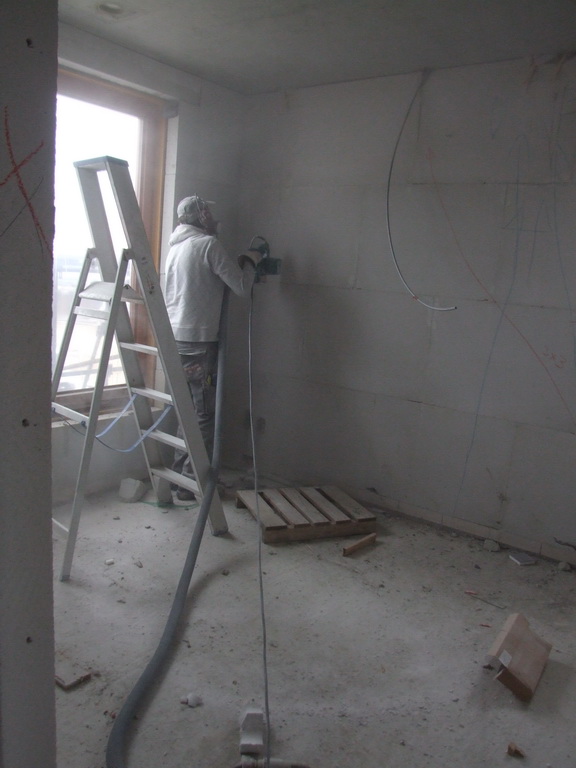 Vorige week is de laatste dakplaat geplaatst en deze week zijn de leidingen ingefreesd en geplaatst.